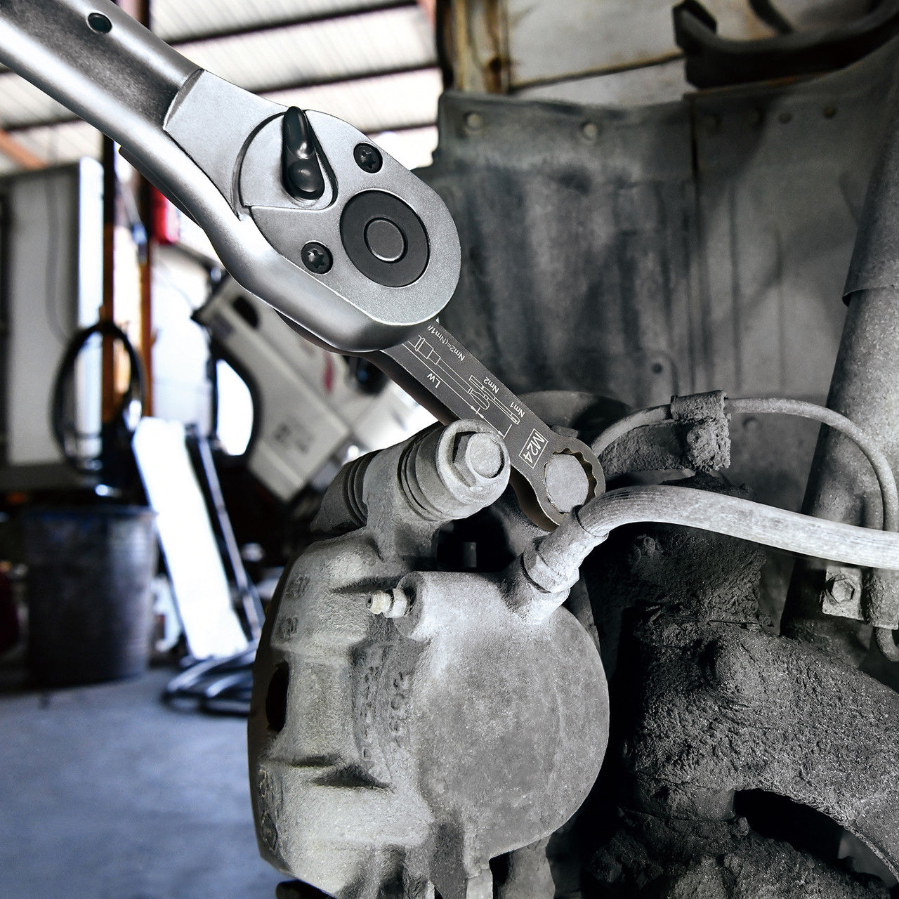TOPTUL JEBT0224 — специализированный ударный ключ с профилем M24 и квадратом 3/4", предназначенный для демонтажа и монтажа тормозных суппортов на коммерческих автомобилях SAF без необходимости снимать рулевую тягу.