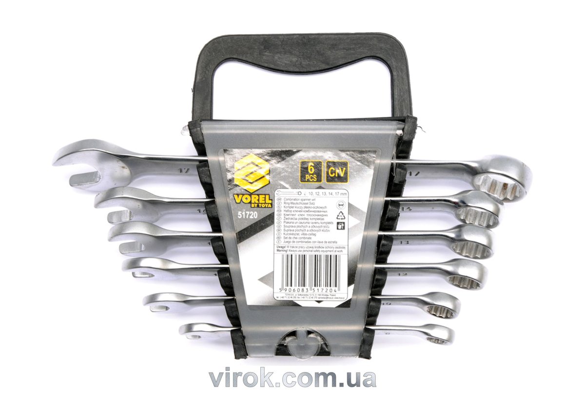 Опис Ключі ріжково-накидні VOREL Cr-V, М 8-17 мм, Набір 6 шт. код товару 51720
