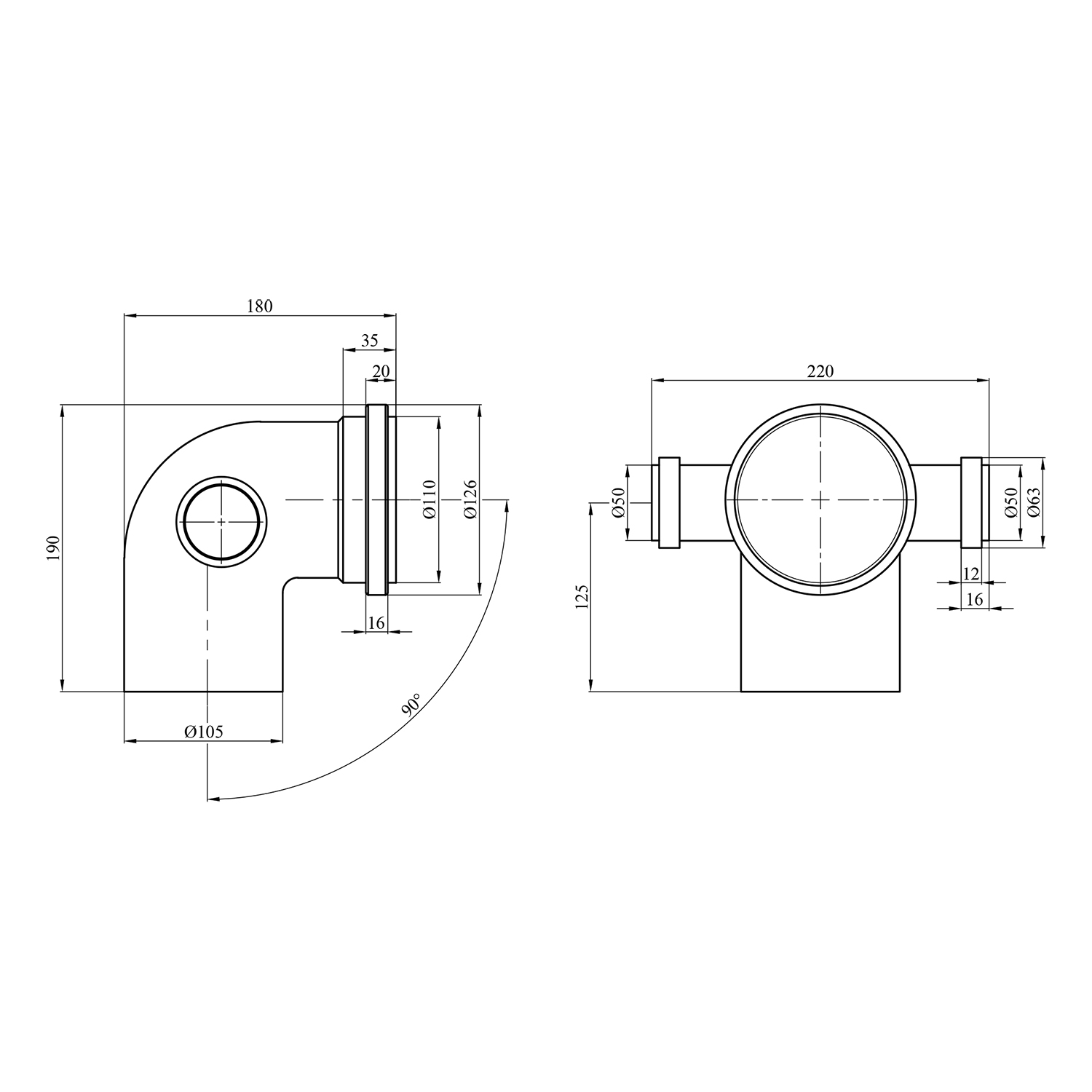 Характеристики Колено двухплоскостное для внутрішньої каналізації Rozma 110х90° з відводами 50 мм ліво-право код товару CV020659