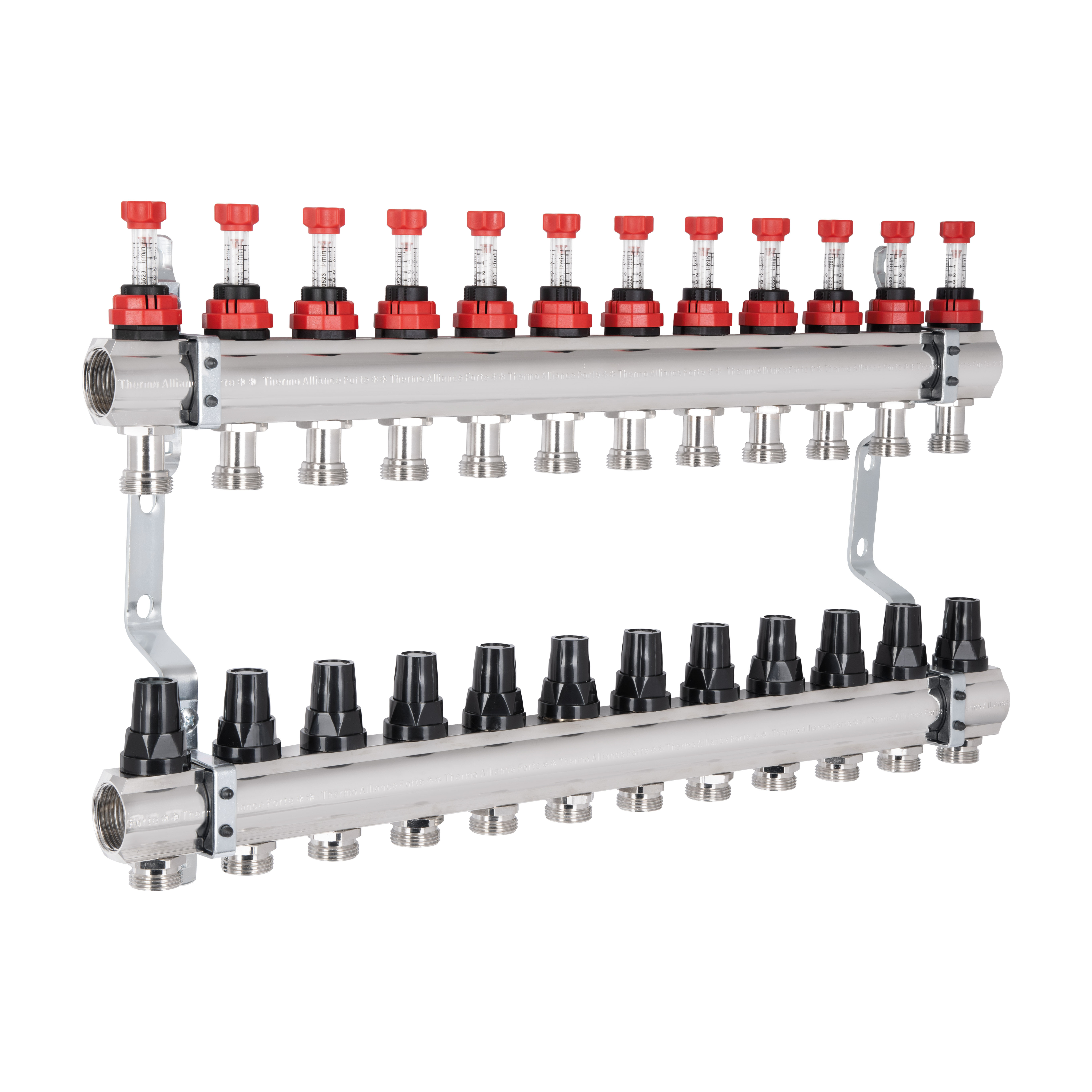 Коллектор с расходомерами SD Forte 1" на 12 выходов отвечает за равномерное распределение тепла в петлях водяного напольного отопления. В составе изделия: две латунные коллекторные балки, расходомеры (на входящей линии), термоклапаны с ручками управления (на обратном коллекторе), кронштейны для крепления в шкафу или на стену. На термостатические клапаны можно установить сервоприводами 30х1,5 (не входят в комплект). Правила эксплуатации задают максимум температуры теплоносителя на входе — 95 °C.