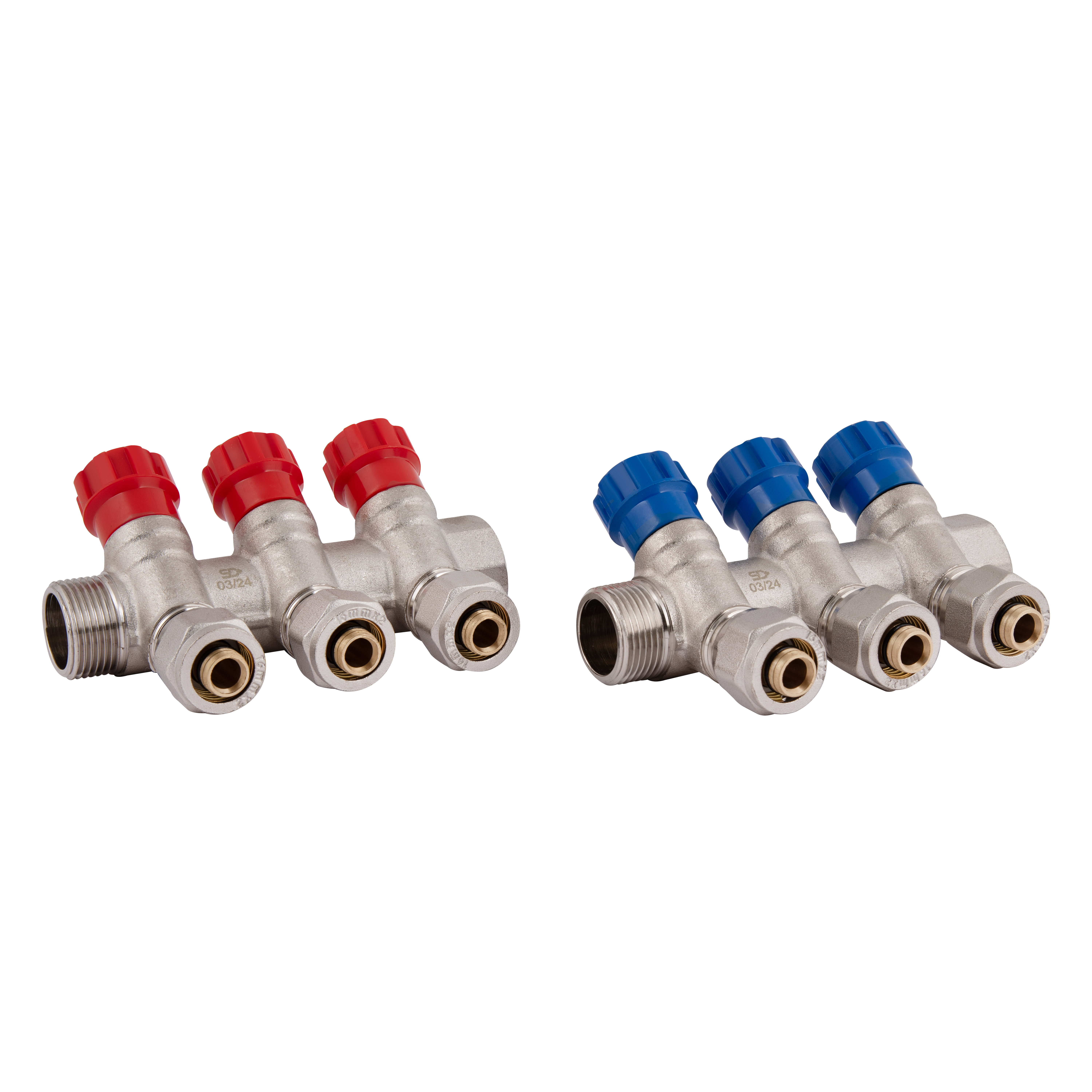 Коллектор SD Plus 3/4" 3 выхода SD230W3 обеспечивает подключение труб и осуществляет гидравлическое распределение воды. Изготавливается из латуни с никелированным покрытием. Изделие может поставляться как с синими, так и с красными регулировочными ручками.