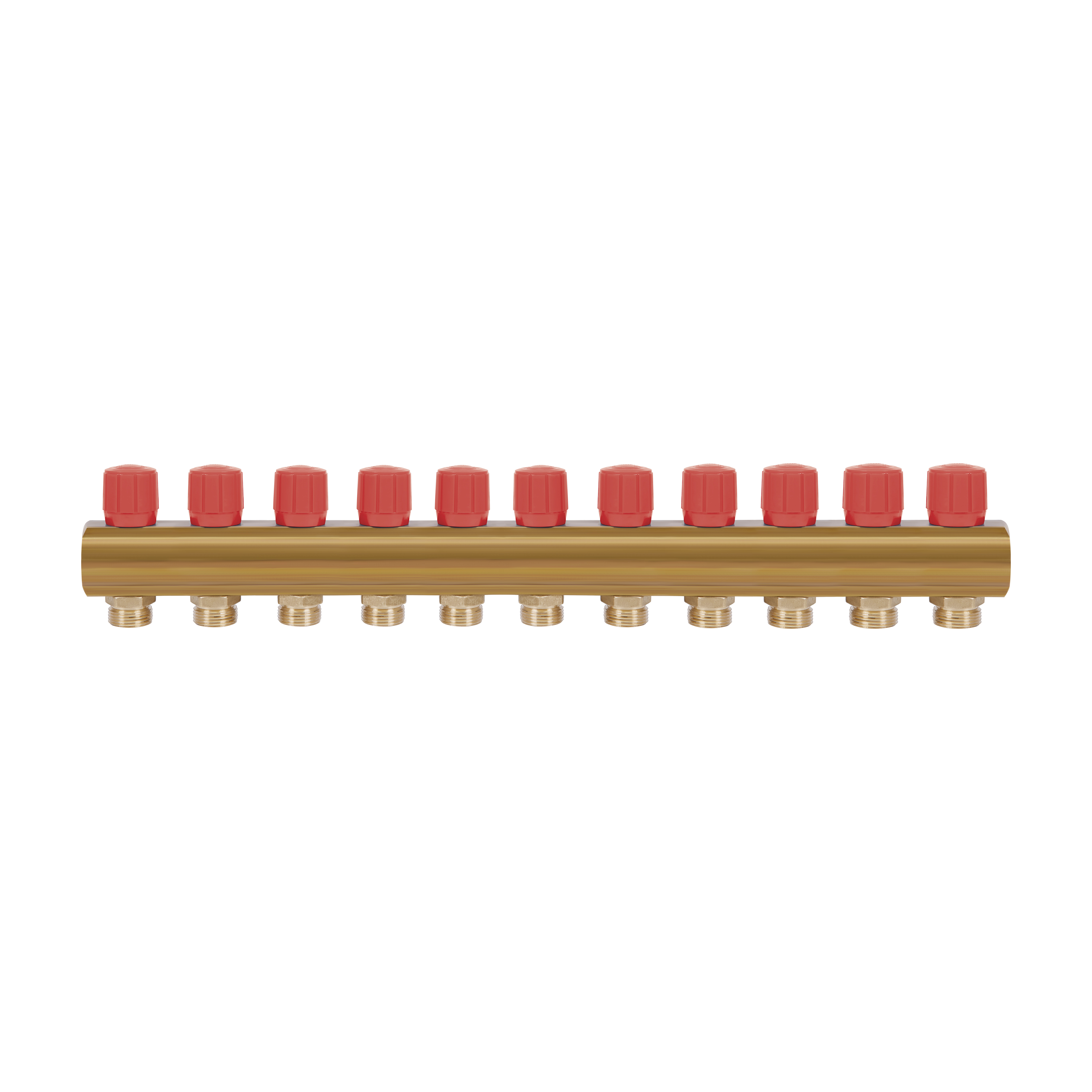 Коллектор Icma с регулировочными вентилями 1" 11 выходов №1105 (Red) предназначен для функционирования в составе системы ГХВС. Ручки ручной регулировки красного цвета. Устройство позволяет подключить одиннадцать линий, ведущих к точкам потребления (смесители, душевые кабины и др.). Такая гребенка позволяет обеспечить равномерное распределение воды, упрощает монтаж, повышает уровень комфорта при эксплуатации сантехнических приборов. Материал изготовления — латунь. Выходи — с наружной резьбой 3/4