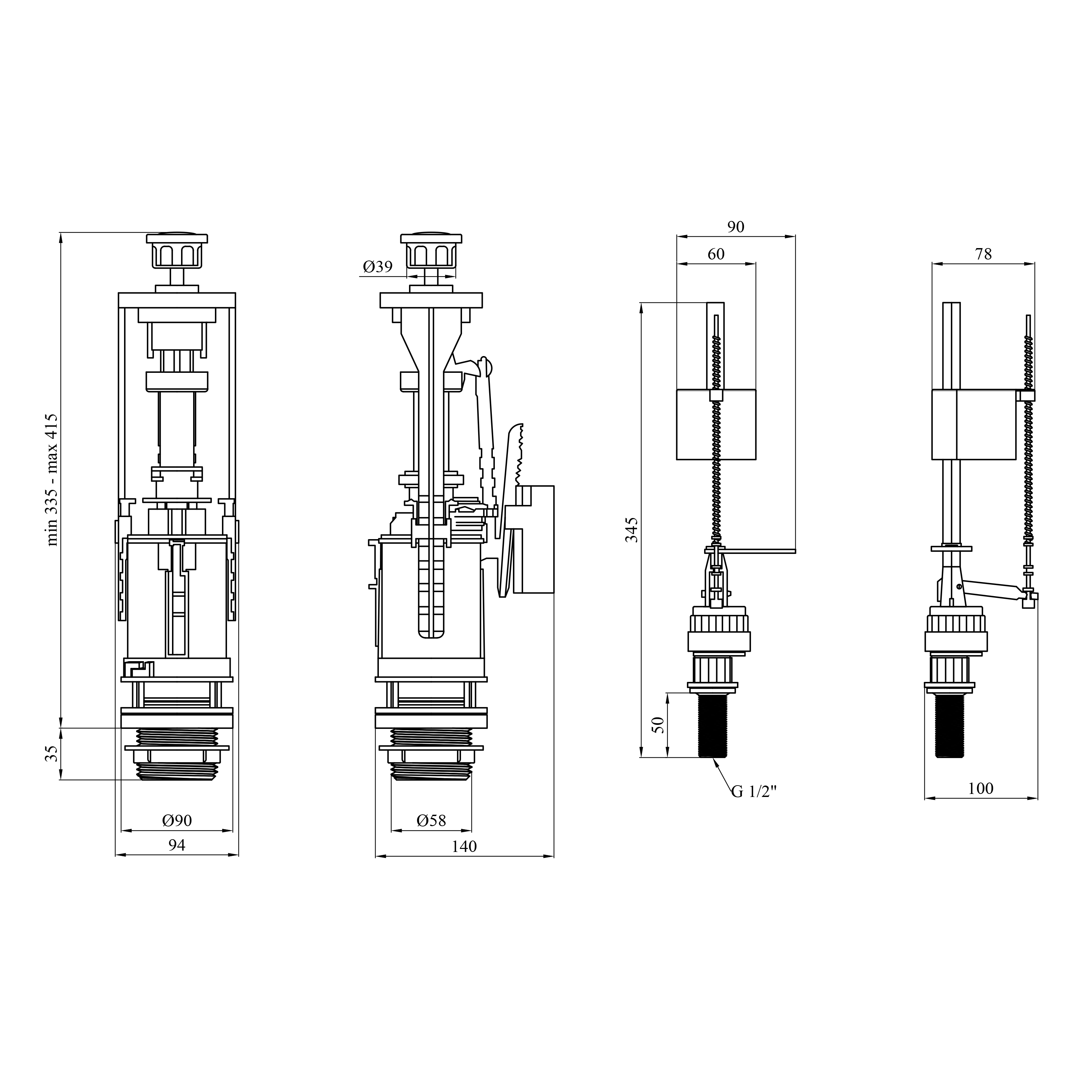 Сливной механизм имеет регулировку высоты установки в пределах от 335 до 415 мм, что обеспечивает совместимость с большинством бачков.