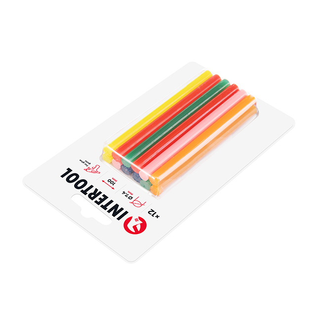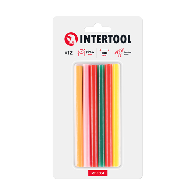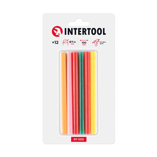 Опис Комплект кольорових клейових стержнів 7.4 мм * 100 мм, 12 шт INTERTOOL RT-1031 код товару RT-1031