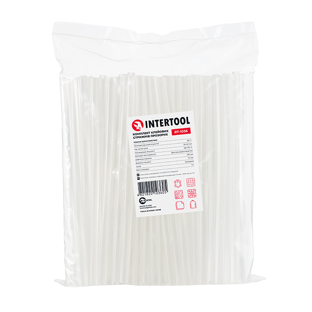 Характеристики Комплект прозорих клеєвих стержнів 7.4мм*200мм, уп. 1кг INTERTOOL RT-1036 код товару RT-1036
