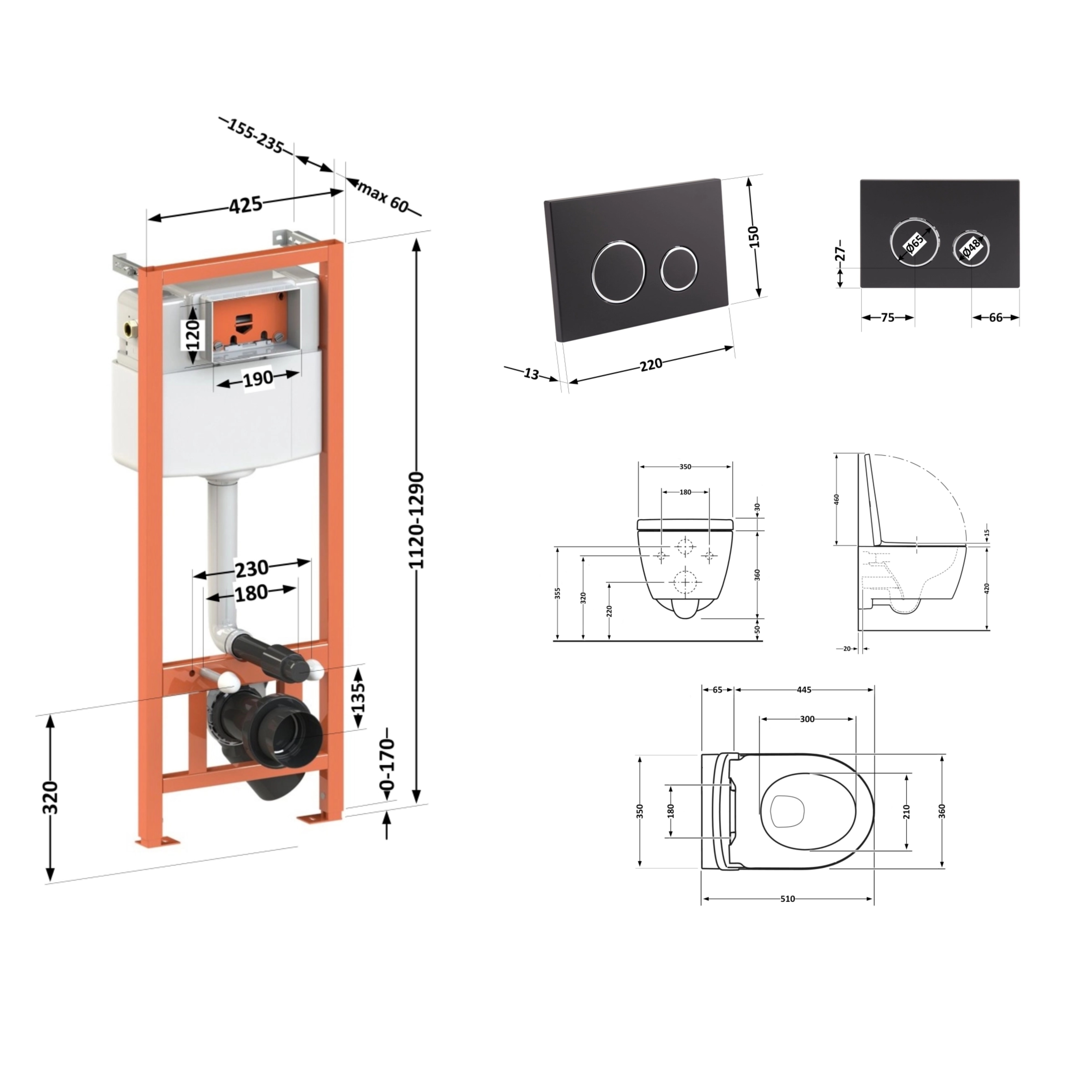 - Унитаз: 355х340х485. Сиденье для унитаза: 55х345х435. Инсталляция: 1280х425х185. Панель смыва: 150х220х30.