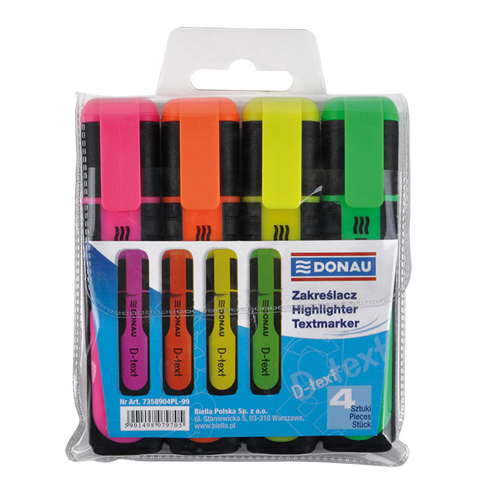 Набір з 4 маркерів у пластиковому футлярі. Для листа на будь-якому типі паперу, у тому числі і на факсовому. Гумові вставки на корпусі запобігають ковзанню та забезпечують комфортний лист. Чорнила на водній основі не токсичні, добре лягають на папір, не вигорають і не розмазуються. Клиноподібний пишучий вузол. Товщина лінії листа: 1-5мм. Довжина суцільної безперервної лінії письма: 200 м. 4 яскраві флуоресцентні кольори. Ковпачок із кліпом.