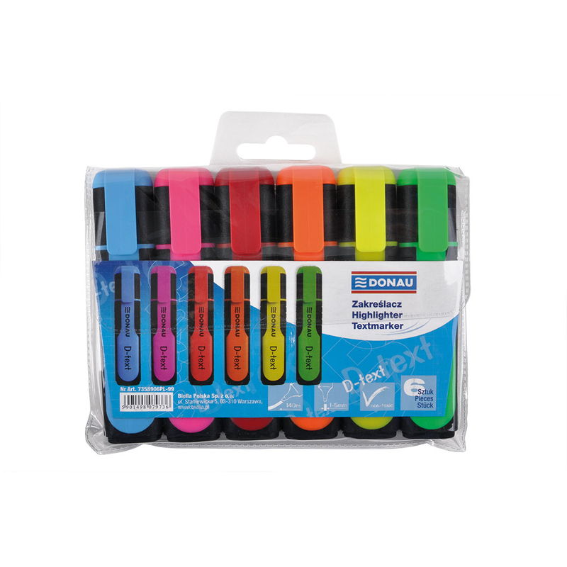 Набір з 6 маркерів у пластиковому футлярі. Для листа на будь-якому типі паперу, у тому числі і на факсовому. Гумові вставки на корпусі запобігають ковзанню та забезпечують комфортний лист. Чорнила на водній основі не токсичні, добре лягають на папір, не вигорають і не розмазуються. Клиноподібний пишучий вузол. Товщина лінії листа: 1-5мм. Довжина суцільної безперервної лінії письма: 140 м. 6 яскравих кольорів флуоресцентних. Ковпачок із кліпом.