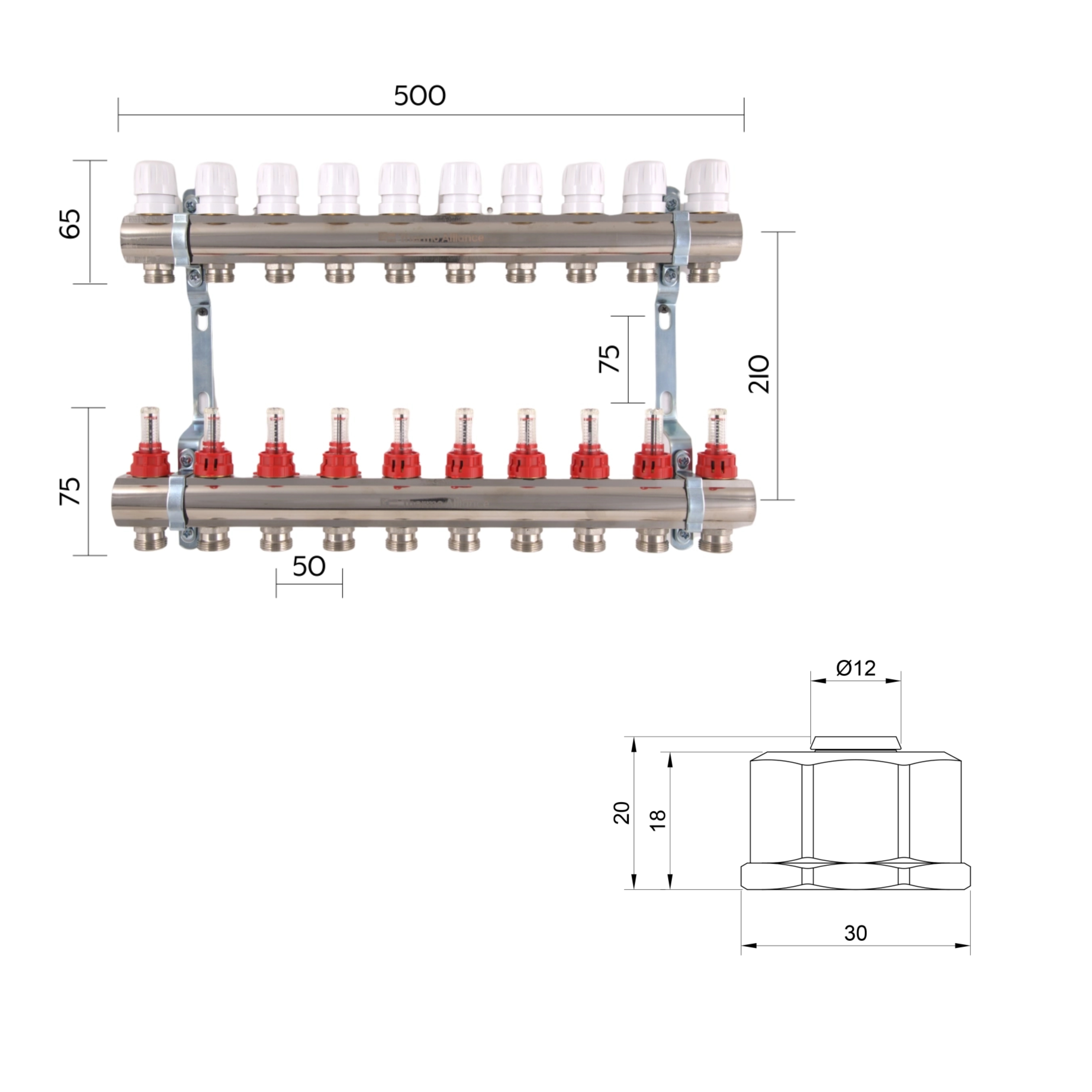 Опис Комплект: Thermo Alliance Standart Коллектор латунный с расходомерами 1"х10 SD235W10 + SD Евроконус 3/4''х16×2 SD346 код товару SD00055015