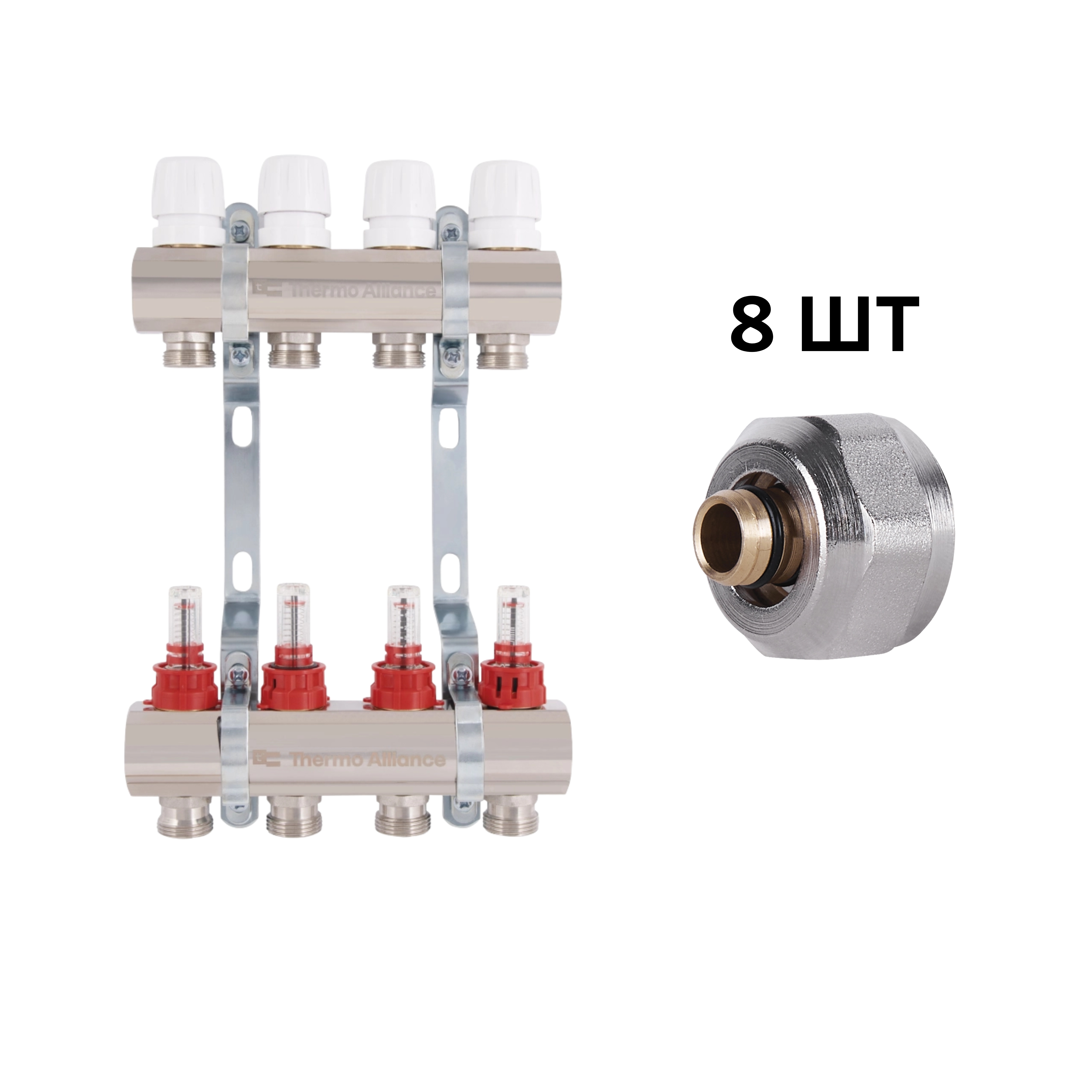 Опис Комплект: Thermo Alliance Standart Коллектор латунный с расходомерами 1"х4 SD235W4 + SD Евроконус 3/4''х16×2 SD346 код товару SD00055009