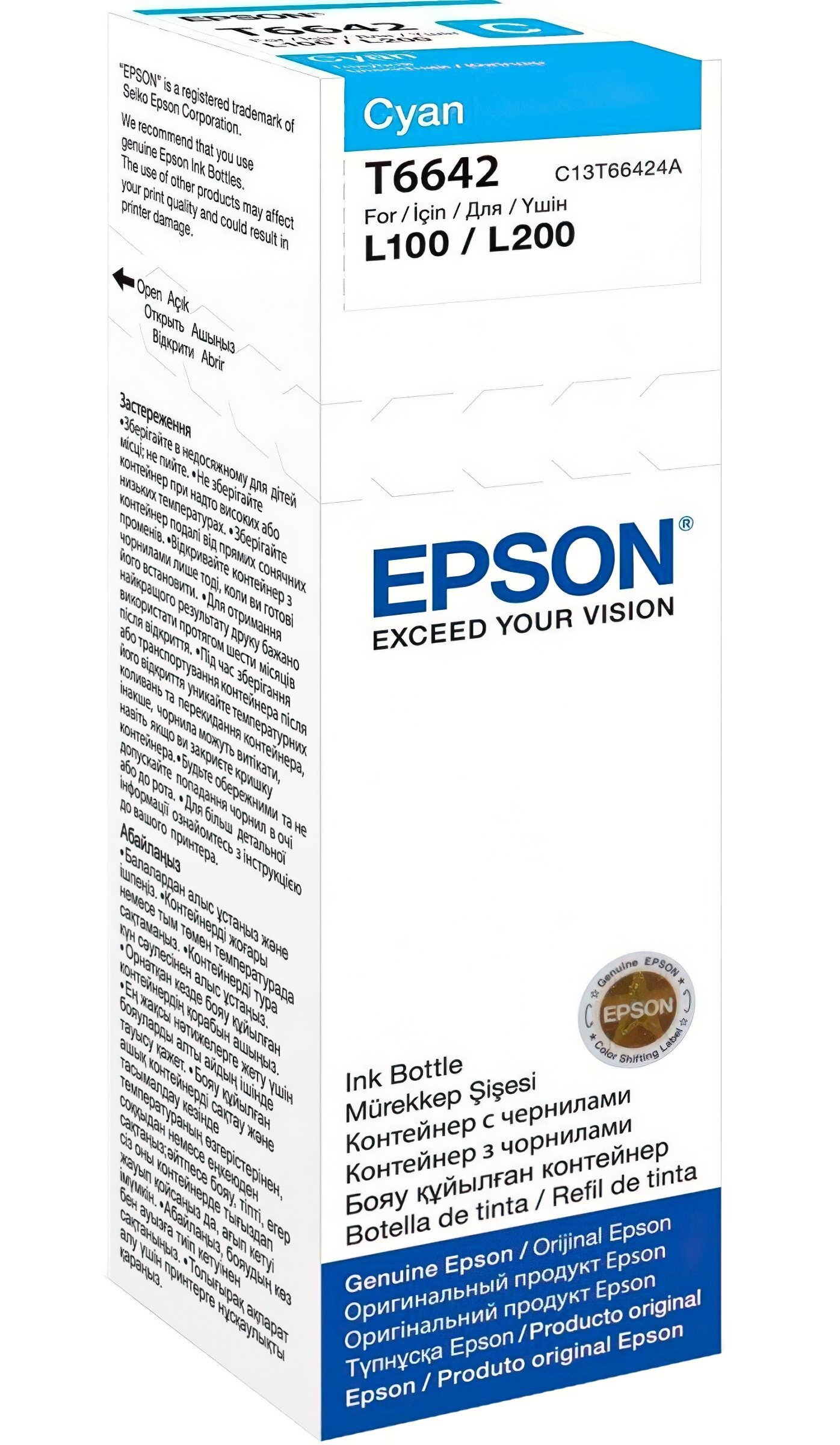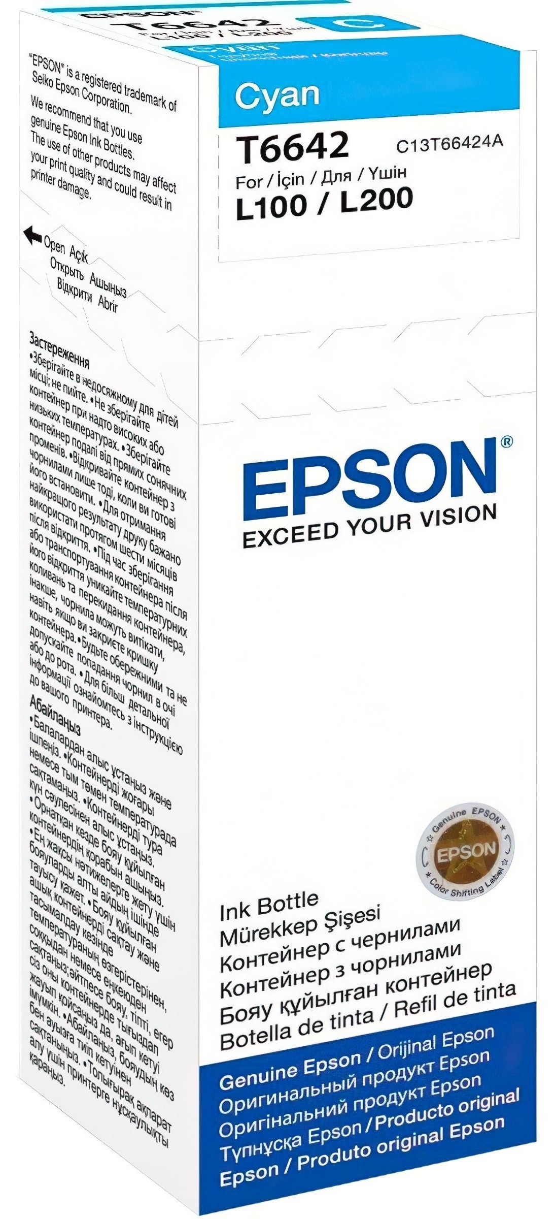 Характеристики Контейнер з чорнилом Epson T6642 EcoTank L110/L120/L121/L1300/L1455/L210/L300/L3050/L3060/L3070/L355/L382/L386/L486/L550/L605/L655/L364/L132/L222/L312/L366/L456/L566 cyan код товару C13T66424A