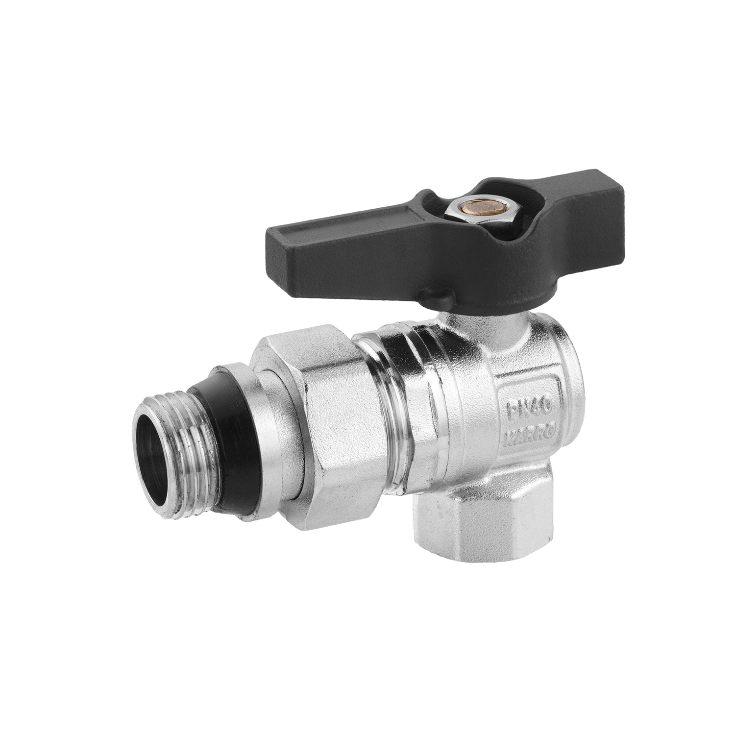 Характеристики Кран-американка шаровой угловой с антипротеканием Karro "Uno Black" 1/2" ВН PN40 бабочка код товару CV035516