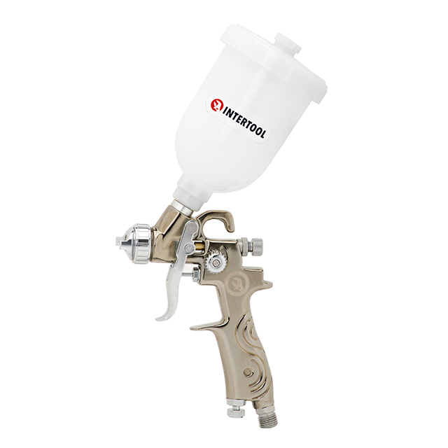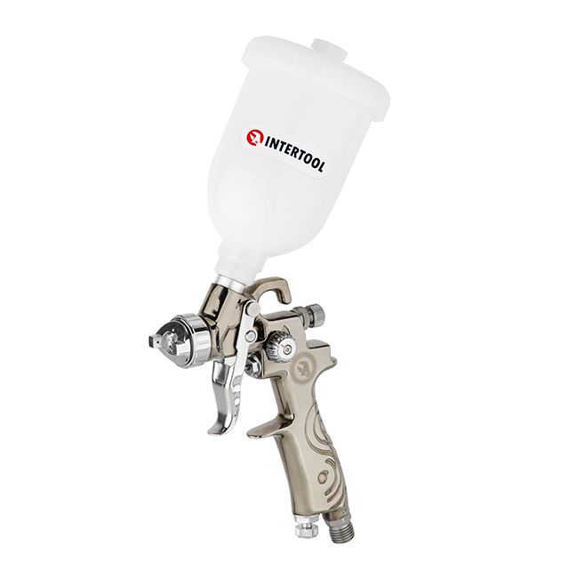 Опис Краскопульт пневматичний LVMP MINI форсунка 0.8 мм, верхній пластиковий бачок 250 мл, 2-2.5 бар INTERTOOL PT-0129 код товару PT-0129