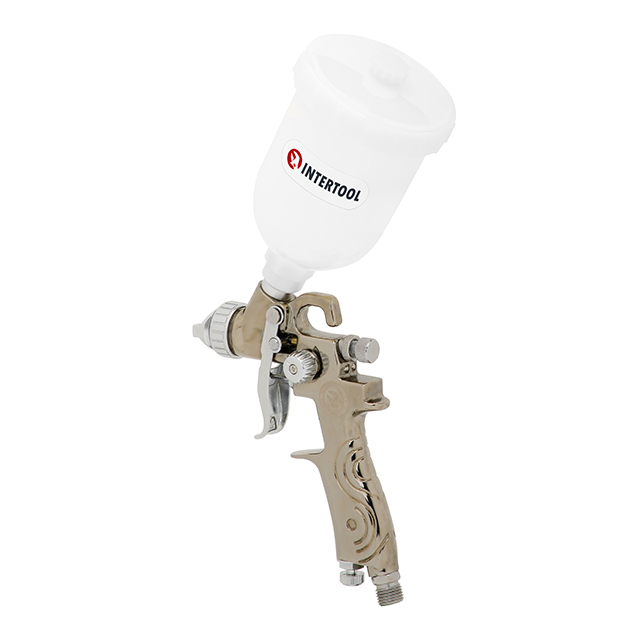 Характеристики Краскопульт пневматичний LVMP MINI форсунка 0.8 мм, верхній пластиковий бачок 250 мл, 2-2.5 бар INTERTOOL PT-0129 код товару PT-0129