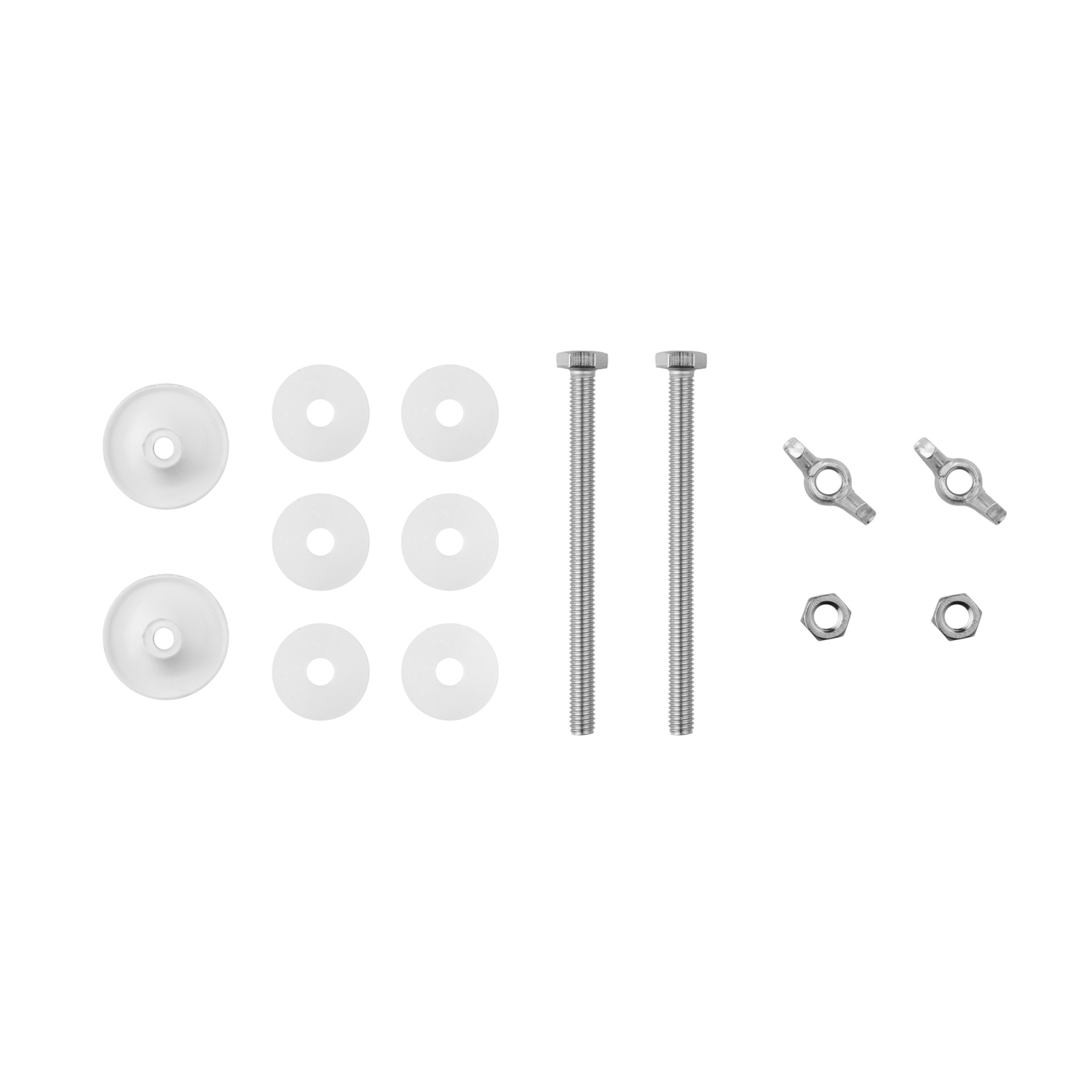 Комплект обеспечивает плотное соединение бачка с чашей унитаза, предотвращает люфт и протекание. Подходит для большинства стандартных моделей унитазов с расстоянием между крепежными отверстиями 100 мм.