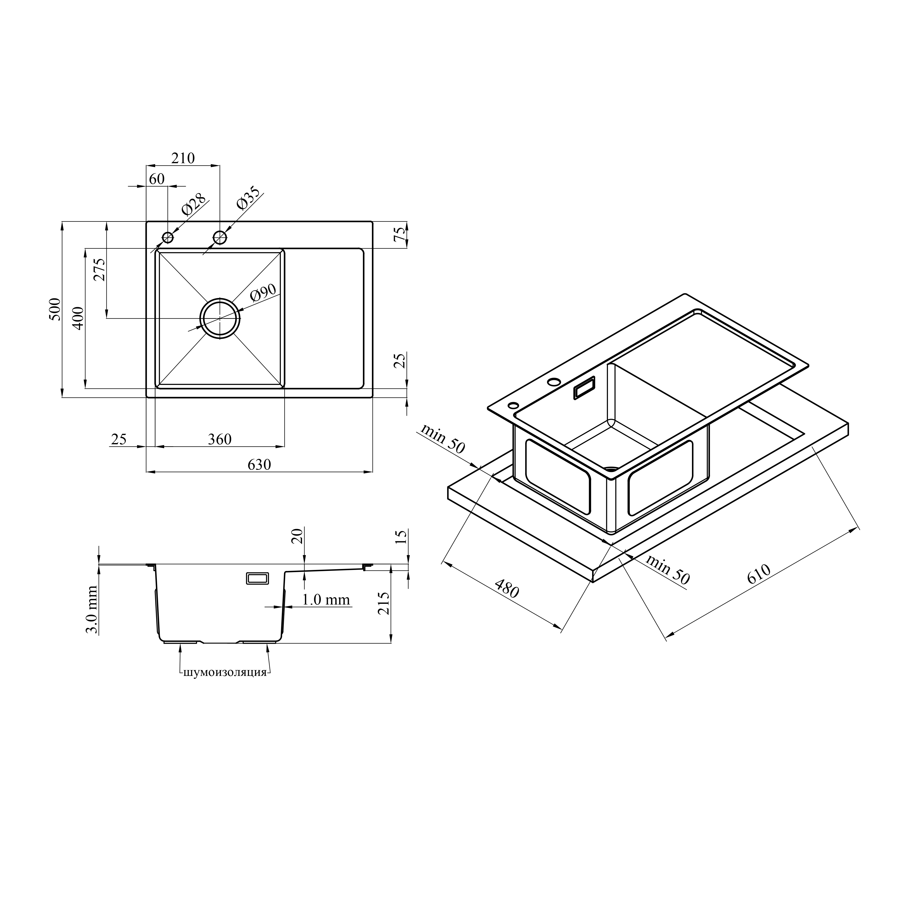 Опис Кухонна мийка Kroner KRP Schwarze - 6350LHM PVD (3,0/1,0 мм) код товару CV031322