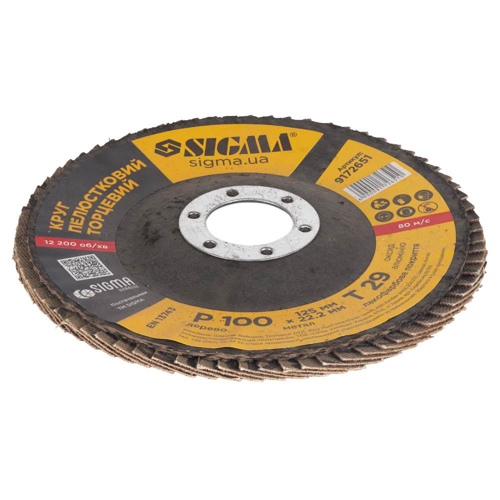 Круг лепестковий торцевий Т29 Ø125мм P100 SIGMA (конічний) 9172651 призначений для шліфування та обробки різних матеріалів, забезпечуючи високу продуктивність та довговічність.