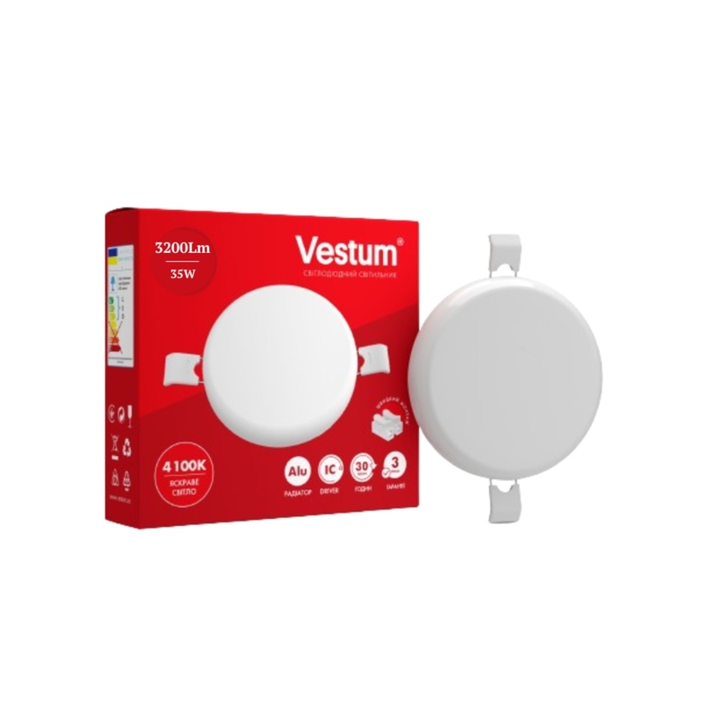 Круглий світлодіодний врізний світильник Vestum 1-VS-5514 потужністю 35 Вт дає 3200 Лм світла. Споживаючи в рази менше електрики, ніж лампи розжарювання або люмінесцентні лампи, світильник дає таку ж кількість світла і прослужить в кілька разів довше. Панель з допомогою розсувних кліпс встановлюється в підготовлений заздалегідь отвір. Світильник має вологозахист IP20 і рекомендується до установки в приміщенні. IC-драйвер забезпечує стабільну роботу світильника в широкому діапазоні напруги, 175-265 В, і запобігає пульсації. Драйвер ізольований, в разі поломки його легко замінити. У світильнику використовуються світлодіоди Epistar, що забезпечують високу енергоефективність і тривалу безперебійну роботу. Переваги LED панелей Vestum: Розсувнi крiплення Драйвер з універсальним з'єднанням. Стабільна робота в широкому діапазоні напруги 175-265 В.