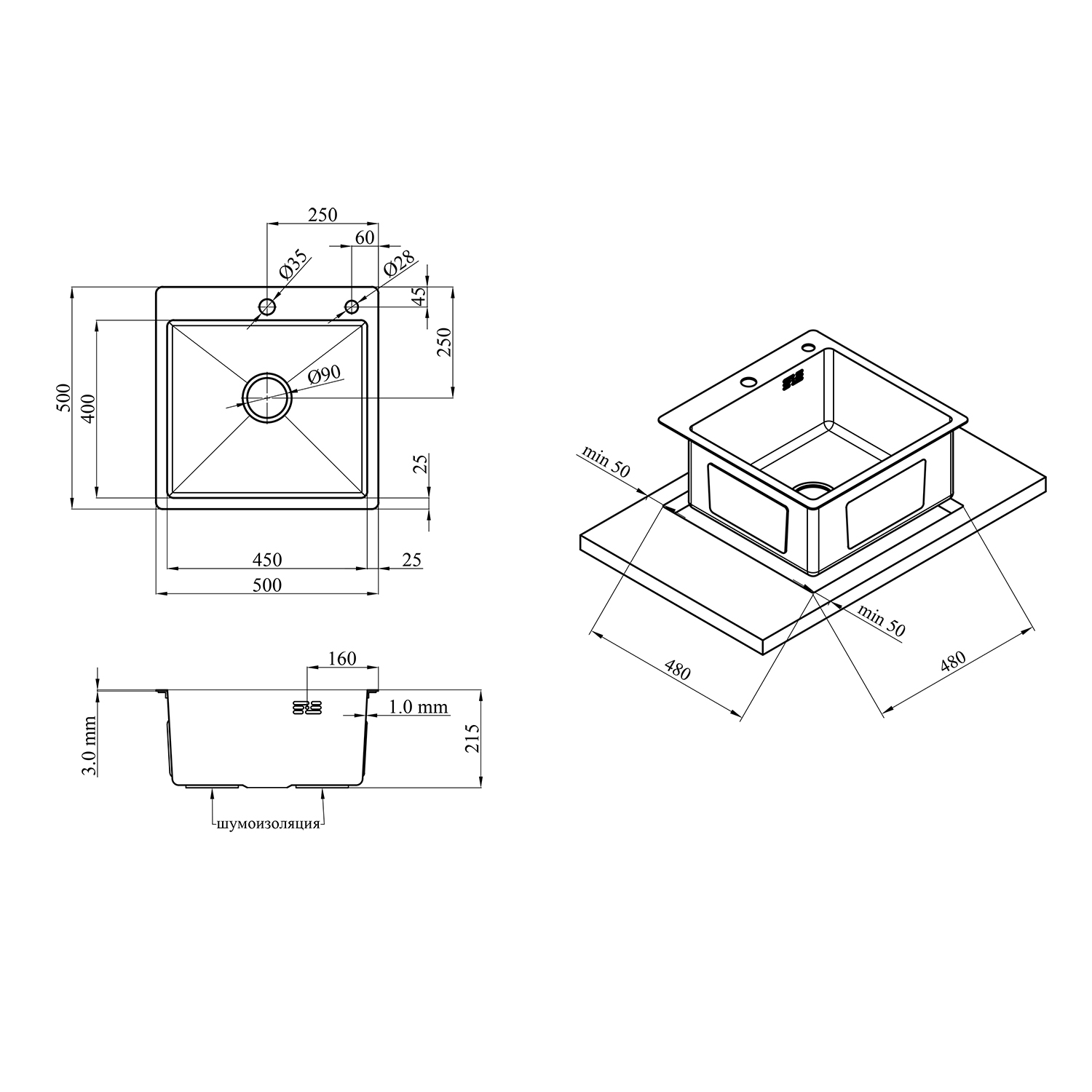 Характеристики Кухонна мийка Kroner KRP Gebürstet - 5050HM (3.0/1.0 мм) код товару CV022800
