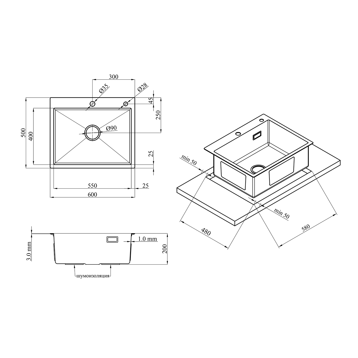 Характеристики Кухонна мийка Kroner KRP Gebürstet - 6050HM (3.0/1.0 мм) код товару CV022802