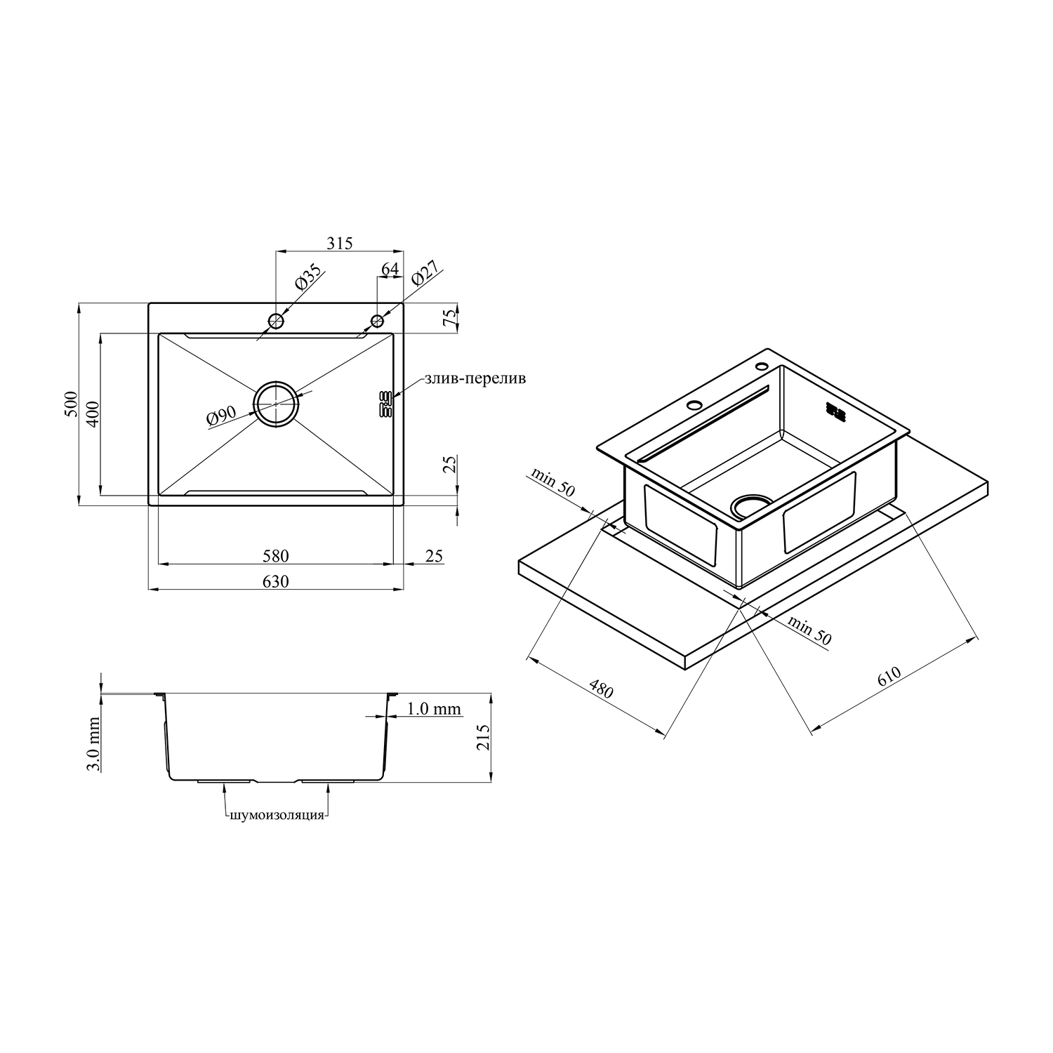 Характеристики Кухонна мийка Kroner KRP Gebürstet - 6350HM (3,0/1,0 мм) код товару CV031452