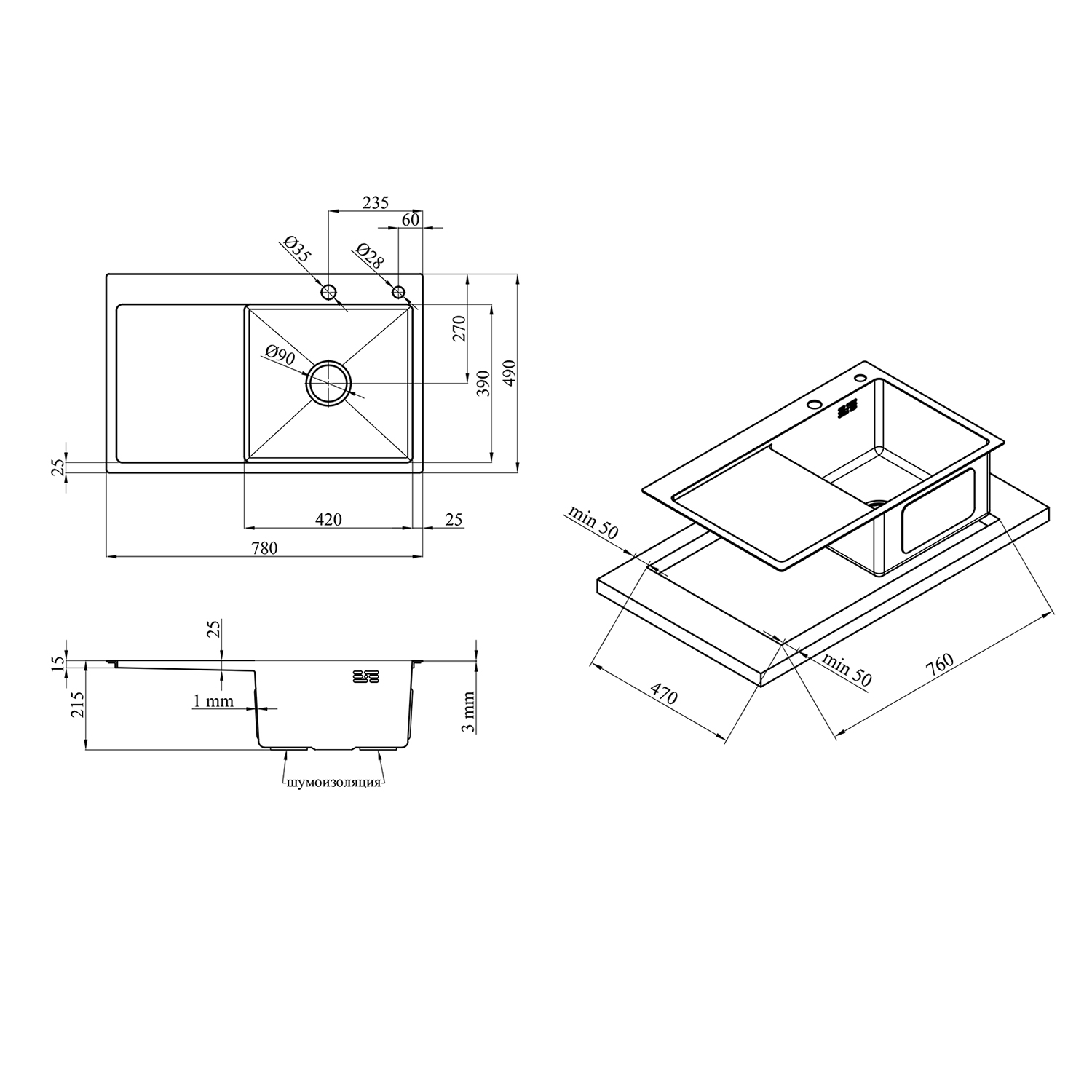 Характеристики Кухонна мийка Kroner KRP Gebürstet - 7849RHM (3.0/1.0 мм) код товару CV025276