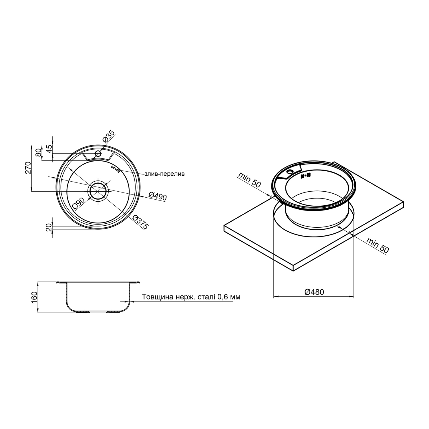 Характеристики Кухонна мийка Kroner KRP Satin - 490 (0,6 мм) код товару CV022764