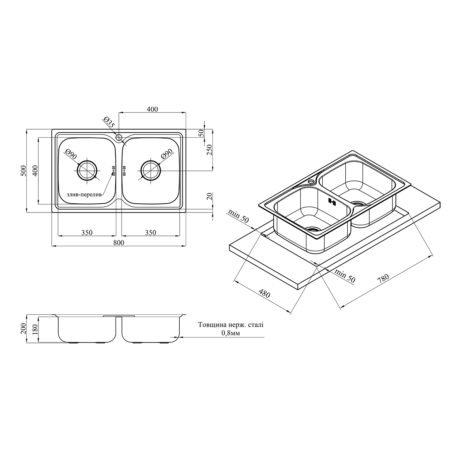 Характеристики Кухонна мийка Kroner KRP Satin - 7948Z (0,8 мм) код товару CV025445
