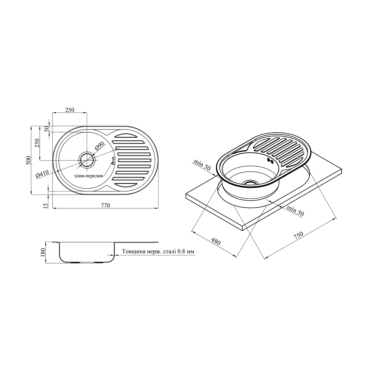 Характеристики Кухонна мийка Kroner KRP Satin - 7750 (0,8 мм) код товару CV022788