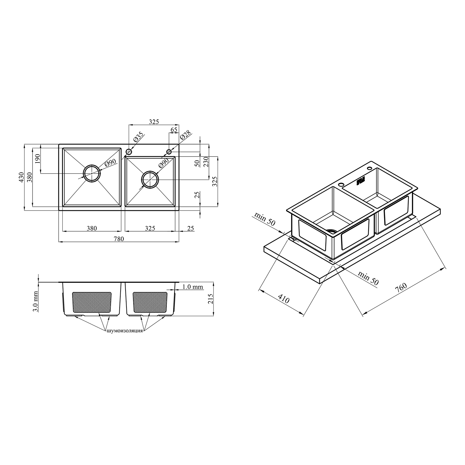 Характеристики Кухонна мийка Kroner KRP Schwarze - 7843ZHM PVD (3,0/1,0 мм) код товару CV022797