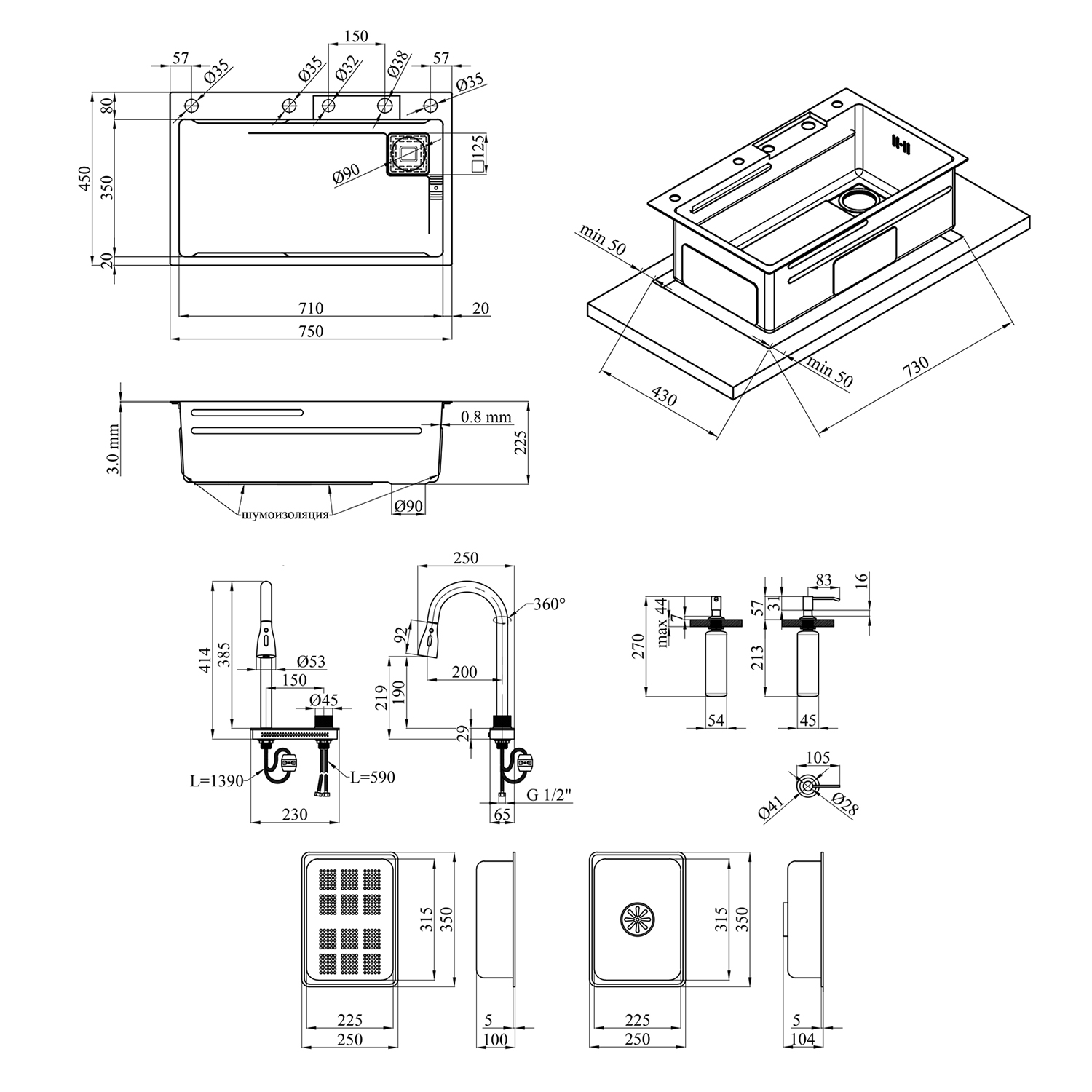 Смеситель, разделочная доска, колландер, поддон для овощей дозатор для моющего средства, сливная арматура, сифон.