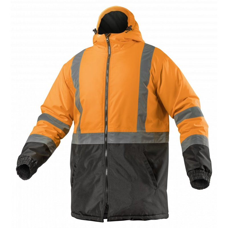 Сучасна чоловіча утеплена куртка-парку. Він має дві світловідбиваючі стрічки навколо плечей та рукавів та одну стрічку навколо тулуба. Ретельно виготовлений із матеріалів високої якості. Забезпечує максимальний комфорт та захист від холоду та вітру. Також захищає від дощу (водонепроникність 2000 мм H₂O). Це підвищує безпеку під час перебування в умовах обмеженої видимості, наприклад, під час руху вночі та за поганих погодних умов, наприклад під час дощу або туману. Особливо рекомендується восени та взимку.