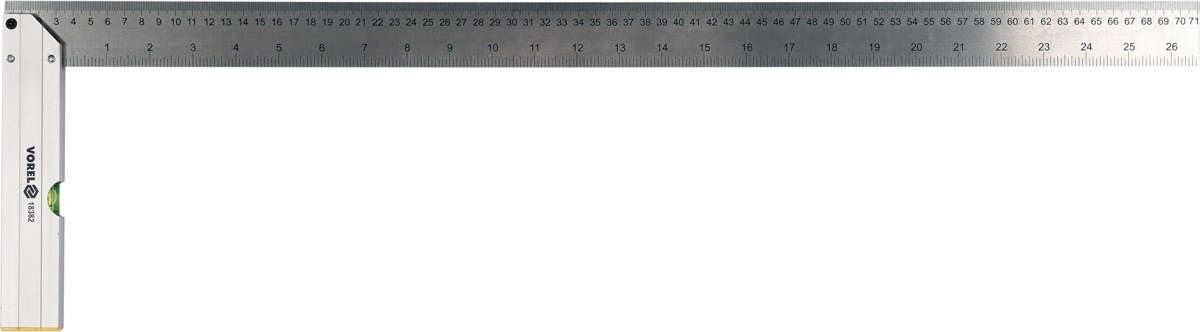 Кутник з рівнем VOREL (L= 700 мм/26.5) – ідеальний інструмент для точних вимірювань. Метрична та дюймова шкали, виготовлений з алюмінію та сталі, забезпечує надійність і довговічність.