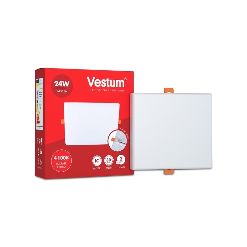 Квадратний світлодіодний врізний світильник Vestum 1-VS-5607 потужністю 24 Вт дає 2400 Лм світла. Споживаючи в рази менше електрики, ніж лампи розжарювання або люмінесцентні лампи, світильник дає таку ж кількість світла і прослужить в кілька разів довше. Панель з допомогою розсувних кліпс встановлюється в підготовлений заздалегідь отвір. Світильник має вологозахист IP20 і рекомендується до установки в приміщенні. IC-драйвер забезпечує стабільну роботу світильника в широкому діапазоні напруги, 175-265 В, і запобігає пульсації. Драйвер ізольований, в разі поломки його легко замінити. У світильнику використовуються світлодіоди Epistar, що забезпечують високу енергоефективність і тривалу безперебійну роботу. Переваги LED панелей Vestum: Розсувнi крiплення Драйвер з універсальним з'єднанням. Стабільна робота в широкому діапазоні напруги 175-265 В.