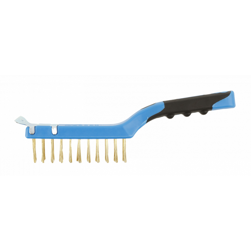 Щітка призначена для видалення іржі, фарби, лаку, зварних швів та бруду. Робота полегшується та прискорюється завдяки твердому пластиковому скребку на кінці головки. Щітка виготовлена з латунного дроту, міцно вмонтованого у пластиковий корпус. Рукоятка має профільовану форму, що полегшує утримання інструменту та підвищує ефективність роботи.