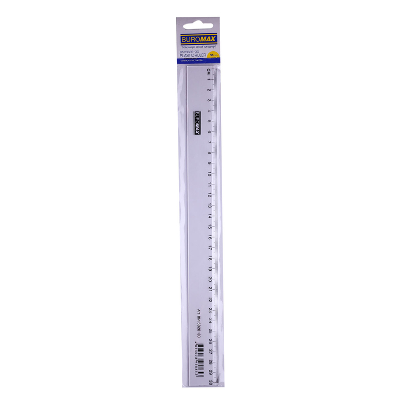 Характеристики Лінійка пластикова, 30 см, прозора, в пласт.пакеті з карт.підвісом 30 (Im-off) код товару BM.5826-30