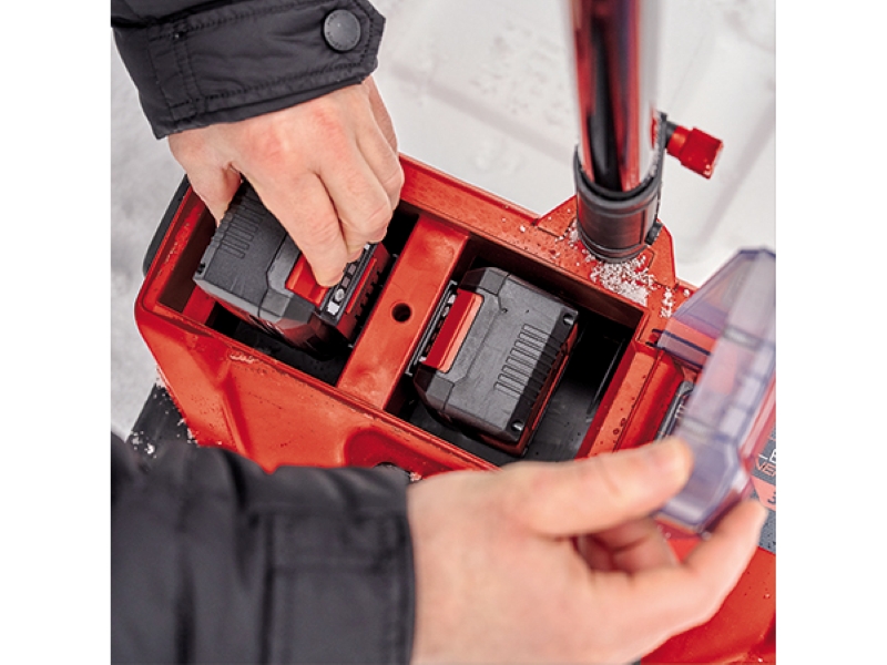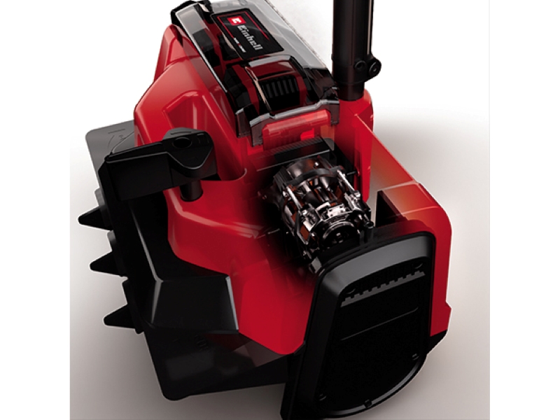 - Поворотний механізм викиду снігу з можливістю зміни напрямку, електронний контроль швидкості обертання, акумуляторний відсік із кришкою на магнітній фіксації для захисту від снігу та вологи, додаткова ручка для керування двома руками, вбудована ручка для
