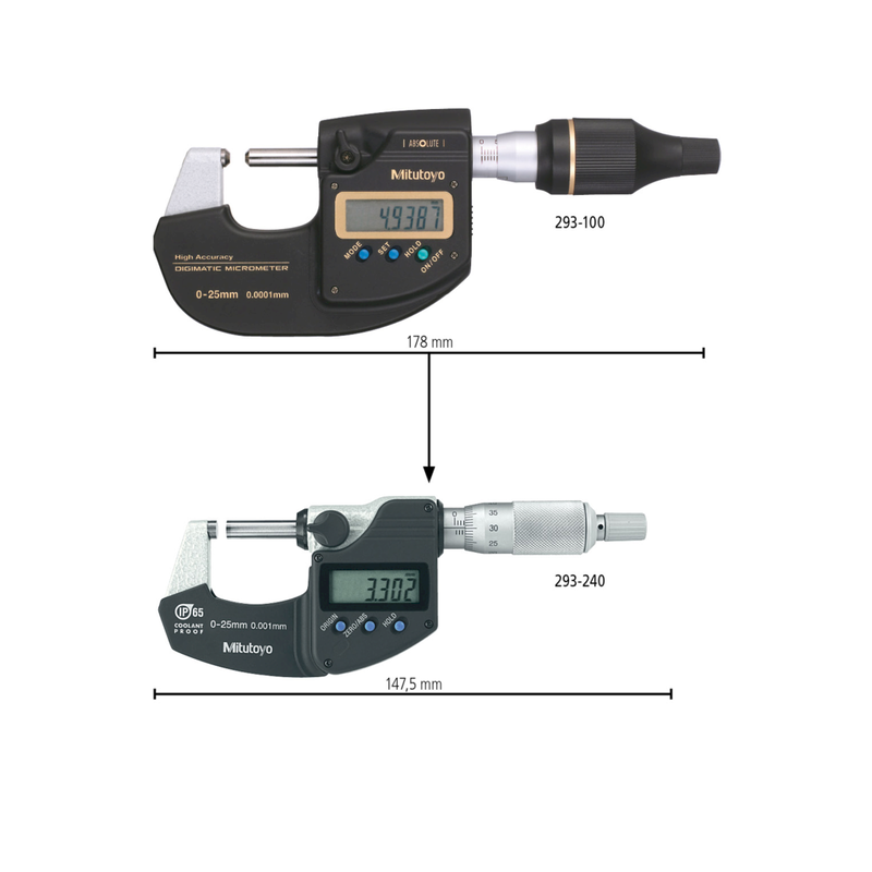Эти микрометры имеют разрешение 0,1 мкм, что позволяет использовать инструмент для решения измерительных задач высокой точности. Высокоточные микрометры оснащены шкалой Absolute и обладают следующими преимуществами: