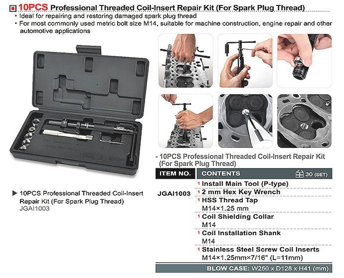 Набір для відновлення різьби свічкових отворів TOPTUL JGAI1003 містить 10 шт. інструментів, призначених для якісного ремонту та відновлення різьби у двигунах. Ідеальний для автосервісів.