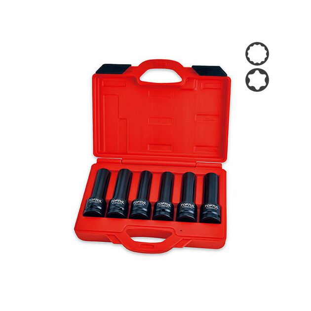 Опис Набір головок довгих ударних 3/4 E18, E20, E22, E24, 17мм, 19мм 6 ед. TOPTUL JGAI0602 код товару JGAI0602