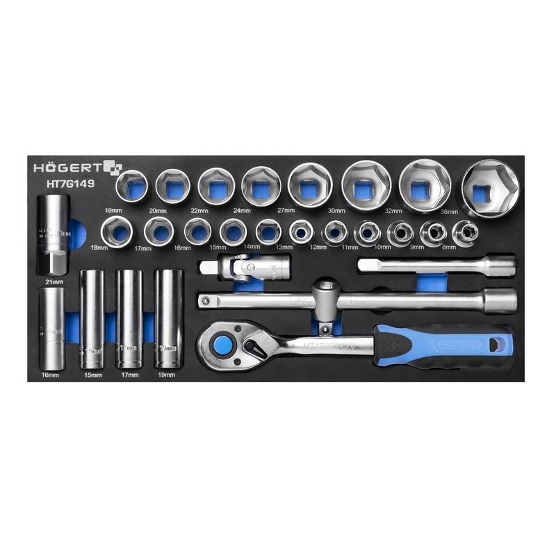 Ложемент для інструментальних візків, що включає тріскачку, набір шестигранних головок і аксесуари розміром 1/2”. Даний ложемент є невід'ємним набором інструментального візка кожного професіонала.