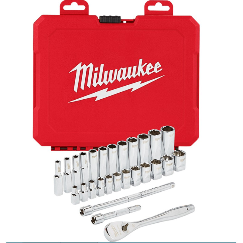 Набір головок торцевих хромованих 1/4'' MILWAUKEE, з тріскачкою та 2 подовжувачами, (28шт), пластико