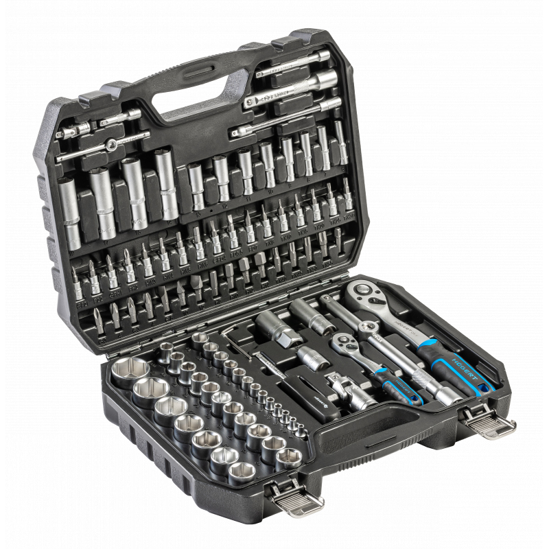 Головки та біти виготовлені з високоякісної легованої сталі CrV стійкі до деформації, штамповане кування храповий механізм тріскачки (72 зуби) виготовлено з високоякісної легованої сталі CrMo, призначеної для роботи при високих навантаженнях практичний кейс з металевими петлями та замками