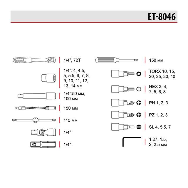 Характеристики Набор инструментов 46 ед. STORM, 1/4", Сr-V INTERTOOL ET-8046 код товару ET-8046