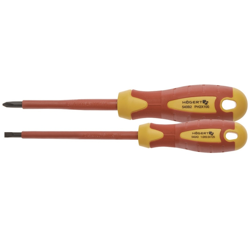 - Набір містить 2 викрутки: з прямим шліцом (SL5,5 125 мм) і хрестову Phillips (PH2 100 мм). Викрутки призначені для електромонтажних робіт під напругою до 1000 В. Розраховані на професійне застосування.