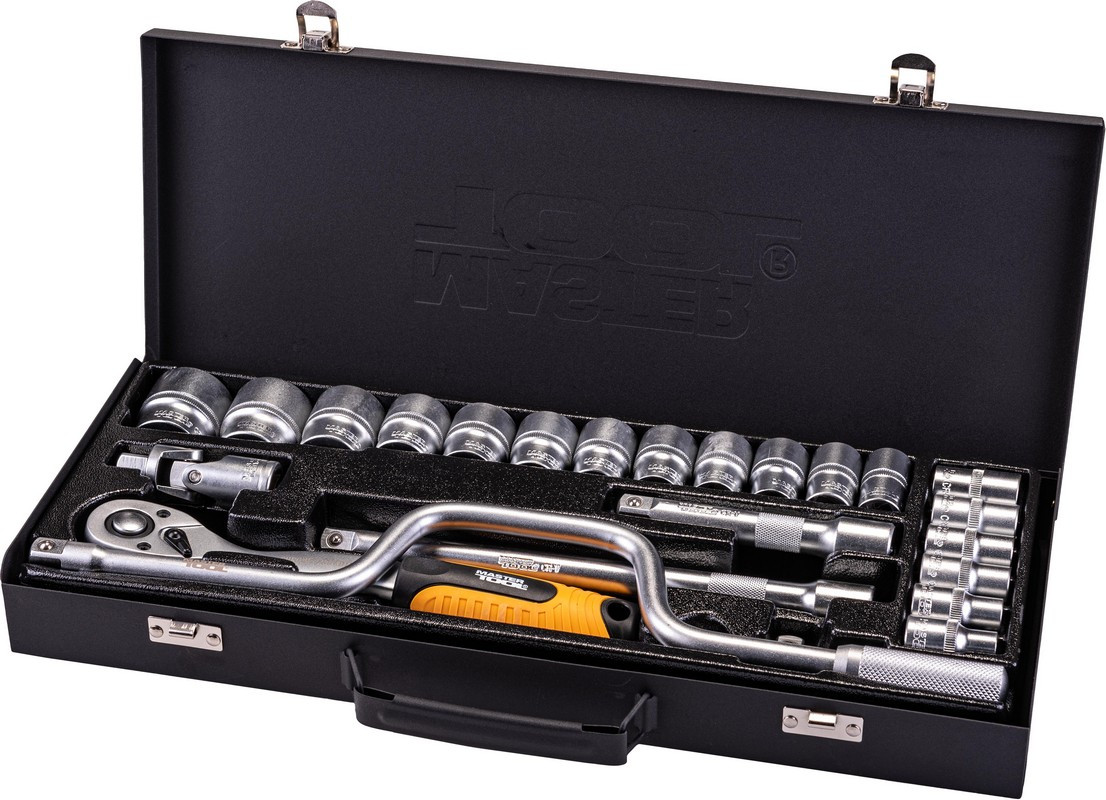 Опис Набір насадок торцевих MASTERTOOL PROFI CrV 1/2 10-32 мм трещотка 72Т 24 шт металевий кейс гнутий вороток код товару 78-4125