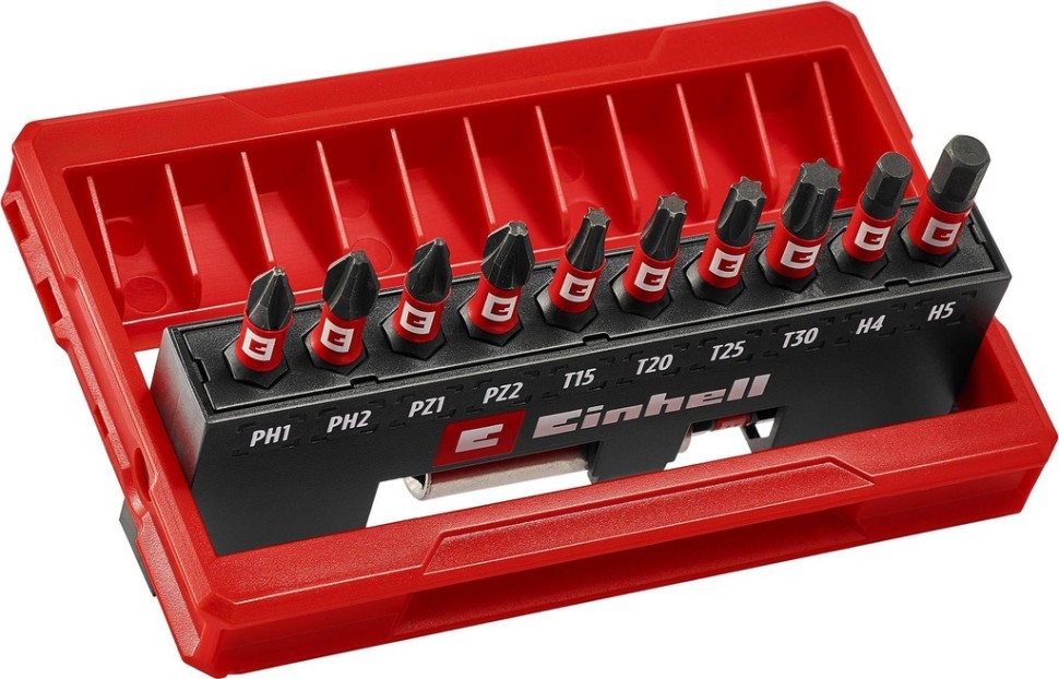 Набір Einhell включає 10 ударних біт 25 мм (PH1, PH2, PZ1, PZ2, T15, T20, T25, T30, H4, H5) та магнітний тримач 60 мм. Біти виготовлені зі сталі S2 з фосфатним покриттям для роботи в ударному режимі. Кожен біт промаркований профілем для швидкого вибору. Компактний кейс з функцією підставки зручно відкривається однією рукою. Ідеально підходить для дому, майстерні та поїздок.