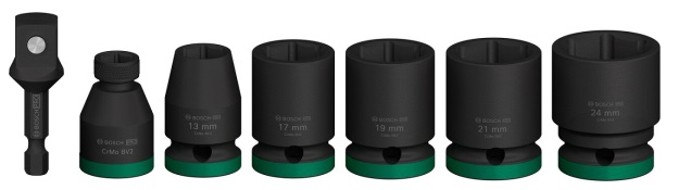 Набір ударних торцевих головок Bosch Pro Impact Socket Standard Set 1/2" 13-24 мм призначений для роботи з кріпленням середнього розміру з використанням ударних гайкокрутів і шуруповертів. Варіанти посадки 1/2 дюйма і перехідники дають змогу використовувати комплект із різним інструментом - як із квадратним, так і з шестигранним хвостовиком.