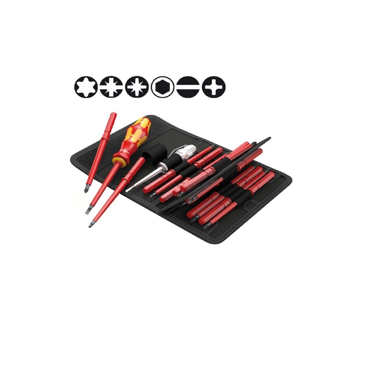 14 змінних викруток VDE з ручкою-тримачем 817 VDE Kraftform і індикатором напруги в міцній поясний сумці. Інструменти перевірені поштучно за стандартом IEC 60900. Поштучна перевірка в водяній бані під напругою 10000 В для безпечної роботи на обладнанні з максимально допустимою напругою 1000 В.