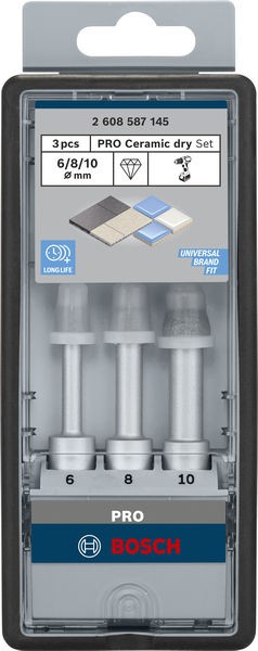 Опис Набір з 3 алмазних свердел Robust Line Easy Dry Best for Ceramic для сухого свердління 6,0; 8,0; 10,0 мм BOSCH код товару 2608587145